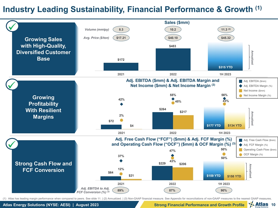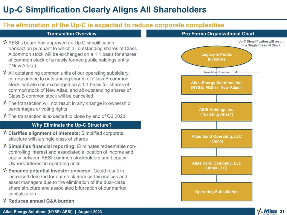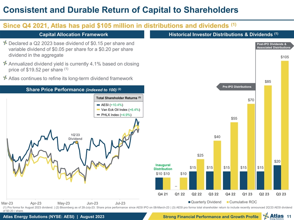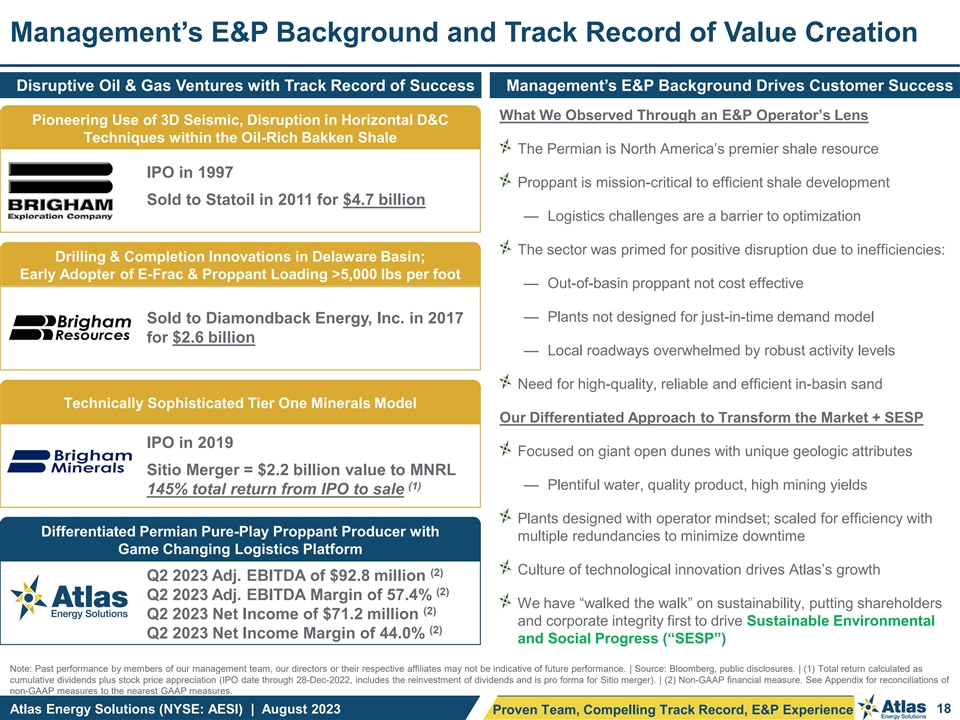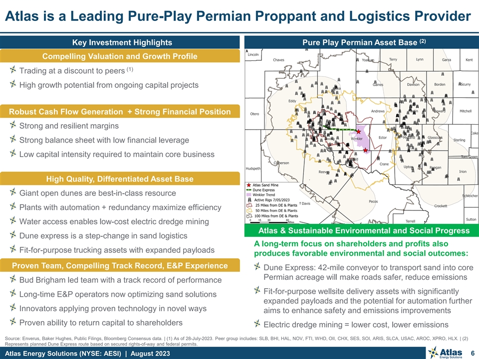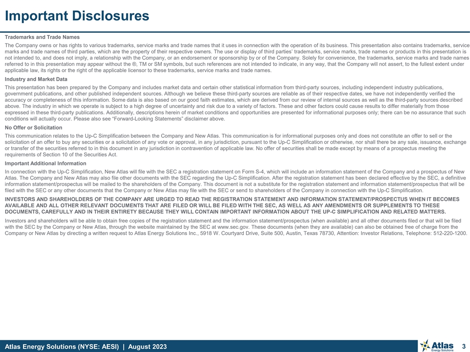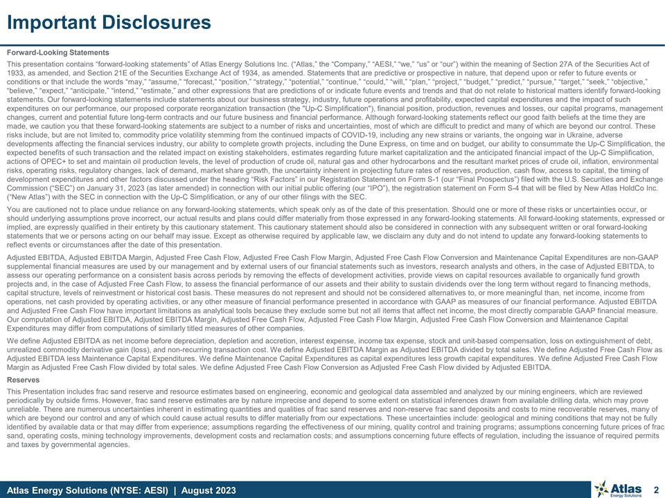 Important Disclosures Forward-Looking Statements This presentation contains “forward-looking statements” of Atlas Energy Solutions Inc. (“Atlas,” the “Company,” “AESI,” “we,” “us” or “our”) within the meaning of Section 27A of the Securities Act of 1933, as amended, and Section 21E of the Securities Exchange Act of 1934, as amended. Statements that are predictive or prospective in nature, that depend upon or refer to future events or conditions or that include the words “may,” “assume,” “forecast,” “position,” “strategy,” “potential,” “continue,” “could,” “will,” “plan,” “project,” “budget,” “predict,” “pursue,” “target,” “seek,” “objective,” “believe,” “expect,” “anticipate,” “intend,” “estimate,” and other expressions that are predictions of or indicate future events and trends and that do not relate to historical matters identify forward-looking statements. Our forward-looking statements include statements about our business strategy, industry, future operations and profitability, expected capital expenditures and the impact of such expenditures on our performance, our proposed corporate reorganization transaction (the Up-C Simplification ), financial position, production, revenues and losses, our capital programs, management changes, current and potential future long-term contracts and our future business and financial performance. Although forward-looking statements reflect our good faith beliefs at the time they are made, we caution you that these forward-looking statements are subject to a number of risks and uncertainties, most of which are difficult to predict and many of which are beyond our control. These risks include, but are not limited to, commodity price volatility stemming from the continued impacts of COVID-19, including any new strains or variants, the ongoing war in Ukraine, adverse developments affecting the financial services industry, our ability to complete growth projects, including the Dune Express, on time and on budget, our ability to consummate the Up-C Simplification, the expected benefits of such transaction and the related impact on existing stakeholders, estimates regarding future market capitalization and the anticipated financial impact of the Up-C Simplification, actions of OPEC+ to set and maintain oil production levels, the level of production of crude oil, natural gas and other hydrocarbons and the resultant market prices of crude oil, inflation, environmental risks, operating risks, regulatory changes, lack of demand, market share growth, the uncertainty inherent in projecting future rates of reserves, production, cash flow, access to capital, the timing of development expenditures and other factors discussed under the heading “Risk Factors” in our Registration Statement on Form S-1 (our “Final Prospectus”) filed with the U.S. Securities and Exchange Commission (“SEC”) on January 31, 2023 (as later amended) in connection with our initial public offering (our “IPO”), the registration statement on Form S-4 that will be filed by New Atlas HoldCo Inc. (“New Atlas”) with the SEC in connection with the Up-C Simplification, or any of our other filings with the SEC. You are cautioned not to place undue reliance on any forward-looking statements, which speak only as of the date of this presentation. Should one or more of these risks or uncertainties occur, or should underlying assumptions prove incorrect, our actual results and plans could differ materially from those expressed in any forward-looking statements. All forward-looking statements, expressed or implied, are expressly qualified in their entirety by this cautionary statement. This cautionary statement should also be considered in connection with any subsequent written or oral forward-looking statements that we or persons acting on our behalf may issue. Except as otherwise required by applicable law, we disclaim any duty and do not intend to update any forward-looking statements to reflect events or circumstances after the date of this presentation. Adjusted EBITDA, Adjusted EBITDA Margin, Adjusted Free Cash Flow, Adjusted Free Cash Flow Margin, Adjusted Free Cash Flow Conversion and Maintenance Capital Expenditures are non-GAAP supplemental financial measures are used by our management and by external users of our financial statements such as investors, research analysts and others, in the case of Adjusted EBITDA, to assess our operating performance on a consistent basis across periods by removing the effects of development activities, provide views on capital resources available to organically fund growth projects and, in the case of Adjusted Free Cash Flow, to assess the financial performance of our assets and their ability to sustain dividends over the long term without regard to financing methods, capital structure, levels of reinvestment or historical cost basis. These measures do not represent and should not be considered alternatives to, or more meaningful than, net income, income from operations, net cash provided by operating activities, or any other measure of financial performance presented in accordance with GAAP as measures of our financial performance. Adjusted EBITDA and Adjusted Free Cash Flow have important limitations as analytical tools because they exclude some but not all items that affect net income, the most directly comparable GAAP financial measure. Our computation of Adjusted EBITDA, Adjusted EBITDA Margin, Adjusted Free Cash Flow, Adjusted Free Cash Flow Margin, Adjusted Free Cash Flow Conversion and Maintenance Capital Expenditures may differ from computations of similarly titled measures of other companies. We define Adjusted EBITDA as net income before depreciation, depletion and accretion, interest expense, income tax expense, stock and unit-based compensation, loss on extinguishment of debt, unrealized commodity derivative gain (los