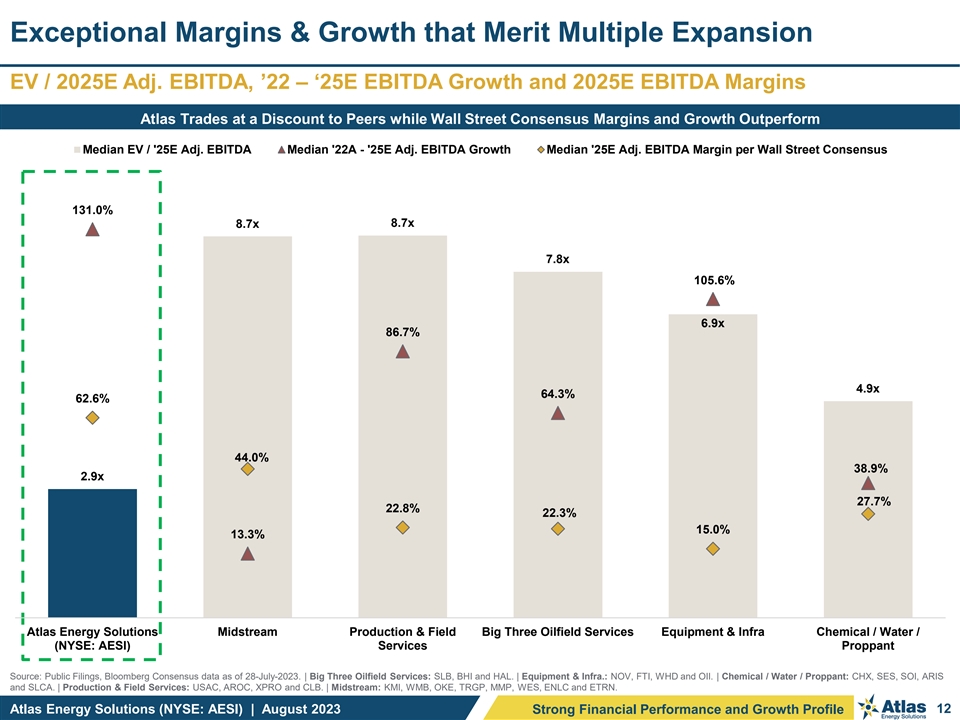 Consistent and Durable Return of Capital to Shareholders (1) Since Q4 2021, Atlas has paid $105 million in distributions and dividends (1) Capital Allocation Framework Historical Investor Distributions & Dividends Declared a Q2 2023 base dividend of $0.15 per share and Post-IPO Dividends & Associated Distributions variable dividend of $0.05 per share for a $0.20 per share dividend in the aggregate $105 Annualized dividend yield is currently 4.1% based on closing (1) price of $19.52 per share Atlas continues to refine its long-term dividend framework $85 Pre-IPO Distributions (2) Share Price Performance (indexed to 100) (3) Total Shareholder Returns $70 AESI (+10.4%) Van Eck Oil Index (+6.4%) PHLX Index (+4.9%) $55 1Q’23 $40 Dividend $25 $20 Inaugural $15 $15 $15 $15 $15 Distribution $10 $10 $10 – Q4 21 Q1 22 Q2 22 Q3 22 Q4 22 Q1 23 Q2 23 Q3 23 Quarterly Dividend Cumulative ROC Mar-23 Apr-23 May-23 Jun-23 Jul-23 (1) Pro forma for August 2023 dividend. | (2) Bloomberg as of 28-July-23. Share price performance since AESI IPO on 08-March-23 | (3) AESI pro forma total shareholder return to include recently announced 2Q’23 AESI dividend of $0.20 / share. Atlas Energy Solutions (NYSE: AESI) | August 2023 11 Strong Financial Performance and Growth Profile