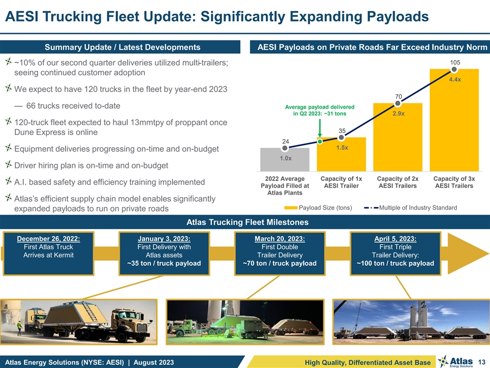 Exceptional Margins & Growth that Merit Multiple Expansion EV / 2025E Adj. EBITDA, ’22 – ‘25E EBITDA Growth and 2025E EBITDA Margins Atlas Trades at a Discount to Peers while Wall Street Consensus Margins and Growth Outperform Median EV / '25E Adj. EBITDA Median '22A - '25E Adj. EBITDA Growth Median '25E Adj. EBITDA Margin per Wall Street Consensus 131.0% 8.7x 8.7x 7.8x 105.6% 6.9x 86.7% 4.9x 64.3% 62.6% 44.0% 38.9% 2.9x 27.7% 22.8% 22.3% 15.0% 13.3% Atlas Energy Solutions Midstream Production & Field Big Three Oilfield Services Equipment & Infra Chemical / Water / (NYSE: AESI) Services Proppant Source: Public Filings, Bloomberg Consensus data as of 28-July-2023. | Big Three Oilfield Services: SLB, BHI and HAL. | Equipment & Infra.: NOV, FTI, WHD and OII. | Chemical / Water / Proppant: CHX, SES, SOI, ARIS and SLCA. | Production & Field Services: USAC, AROC, XPRO and CLB. | Midstream: KMI, WMB, OKE, TRGP, MMP, WES, ENLC and ETRN. Atlas Energy Solutions (NYSE: AESI) | August 2023 12 Strong Financial Performance and Growth Profile