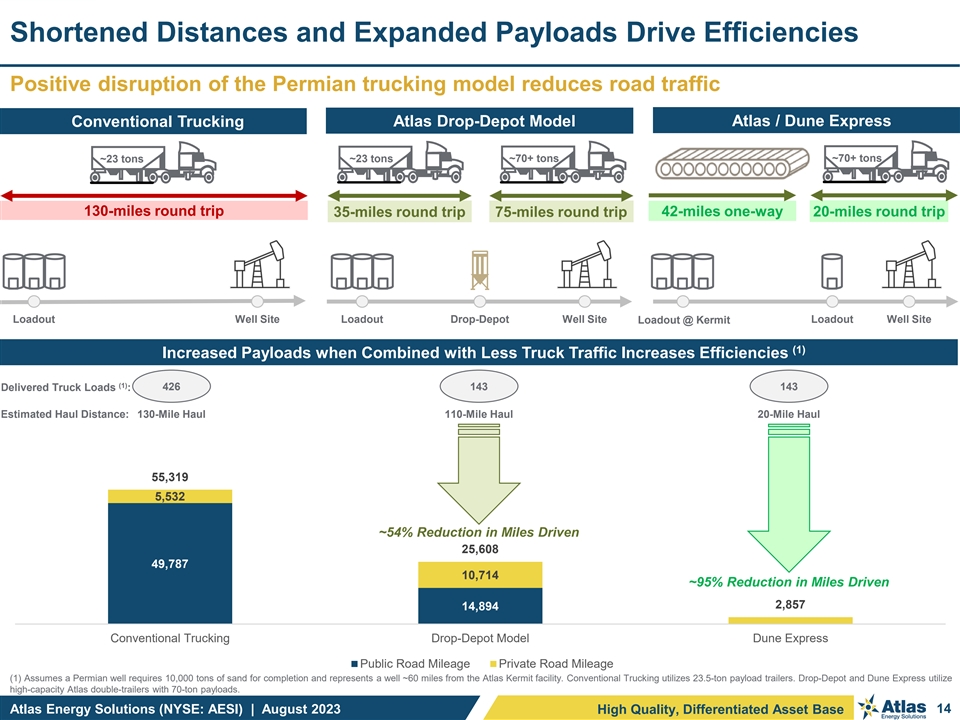 AESI Trucking Fleet Update: Significantly Expanding Payloads Summary Update / Latest Developments AESI Payloads on Private Roads Far Exceed Industry Norm 120 5.0x 105 ~10% of our second quarter deliveries utilized multi-trailers; 4.5x 100 seeing continued customer adoption 4.0x 4.4x 3.5x We expect to have 120 trucks in the fleet by year-end 2023 80 70 3.0x — 66 trucks received to-date Average payload delivered 60 2.5x in Q2 2023: ~31 tons 2.9x 2.0x 120-truck fleet expected to haul 13mmtpy of proppant once 40 35 Dune Express is online 1.5x 24 1.0x 1.5x Equipment deliveries progressing on-time and on-budget 20 1.0x 0.5x Driver hiring plan is on-time and on-budget – – 2022 Average Capacity of 1x Capacity of 2x Capacity of 3x A.I. based safety and efficiency training implemented Payload Filled at AESI Trailer AESI Trailers AESI Trailers Atlas Plants Atlas’s efficient supply chain model enables significantly Payload Size (tons) Multiple of Industry Standard expanded payloads to run on private roads Atlas Trucking Fleet Milestones December 26, 2022: January 3, 2023: March 20, 2023: April 5, 2023: : First Atlas Truck First Delivery with First Double First Triple Arrives at Kermit Atlas assets Trailer Delivery Trailer Delivery: ~35 ton / truck payload ~70 ton / truck payload ~100 ton / truck payload Atlas Energy Solutions (NYSE: AESI) | August 2023 13 High Quality, Differentiated Asset Base