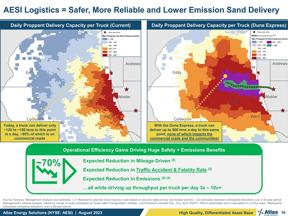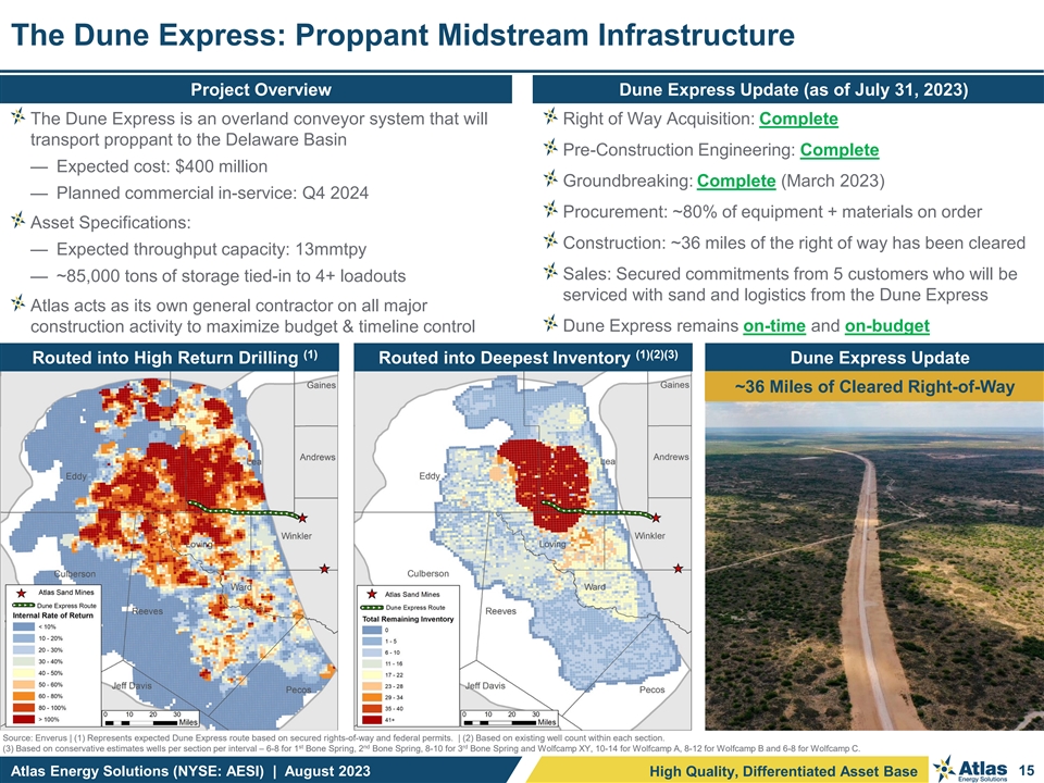 Shortened Distances and Expanded Payloads Drive Efficiencies Positive disruption of the Permian trucking model reduces road traffic Conventional Trucking Atlas Drop-Depot Model Atlas / Dune Express ~23 tons ~23 tons ~70+ tons ~70+ tons 130-miles round trip 42-miles one-way 35-miles round trip 75-miles round trip 20-miles round trip Loadout Well Site Loadout Drop-Depot Well Site Loadout Well Site Loadout @ Kermit (1) Increased Payloads when Combined with Less Truck Traffic Increases Efficiencies (1) Delivered Truck Loads : 426 143 143 Estimated Haul Distance: 130-Mile Haul 110-Mile Haul 20-Mile Haul 55,319 5,532 ~54% Reduction in Miles Driven 25,608 49,787 10,714 ~95% Reduction in Miles Driven 2,857 14,894 Conventional Trucking Drop-Depot Model Dune Express Public Road Mileage Private Road Mileage (1) Assumes a Permian well requires 10,000 tons of sand for completion and represents a well ~60 miles from the Atlas Kermit facility. Conventional Trucking utilizes 23.5-ton payload trailers. Drop-Depot and Dune Express utilize high-capacity Atlas double-trailers with 70-ton payloads. Atlas Energy Solutions (NYSE: AESI) | August 2023 14 High Quality, Differentiated Asset Base