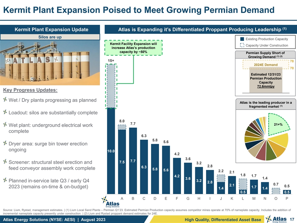 AESI Logistics = Safer, More Reliable and Lower Emission Sand Delivery Daily Proppant Delivery Capacity per Truck (Current) Daily Proppant Delivery Capacity per Truck (Dune Express) (1) Today, a truck can deliver only With the Dune Express, a truck can ~125 to ~150 tons to this point deliver up to 500 tons a day to this same in a day, ~95% of which is on point, none of which impacts the commercial roads commercial roads and the communities! Operational Efficiency Gains Driving Huge Safety + Emissions Benefits (2) Expected Reduction in Mileage Driven ~70% (2) Expected Reduction in Traffic Accident & Fatality Rate (2) (3) Expected Reduction in Emissions …all while driving up throughput per truck per day 3x – 10x+ Source: Enverus, Management analysis and estimates. | (1) Represents planned Dune Express route based on secured rights-of-way and federal permits. | (2) Estimates represent anticipated reductions over a 30-year period; Management’s internal analysis, based on results of study completed by Texas A&M Transportation Institute. | (3) Emissions includes CO , CH , N O, PM10 + PM2.5 particulates and is calculated on a CO e basis. Represents 2 4 2 2 anticipated emissions reductions over a 30-year period. Atlas Energy Solutions (NYSE: AESI) | August 2023 16 High Quality, Differentiated Asset Base