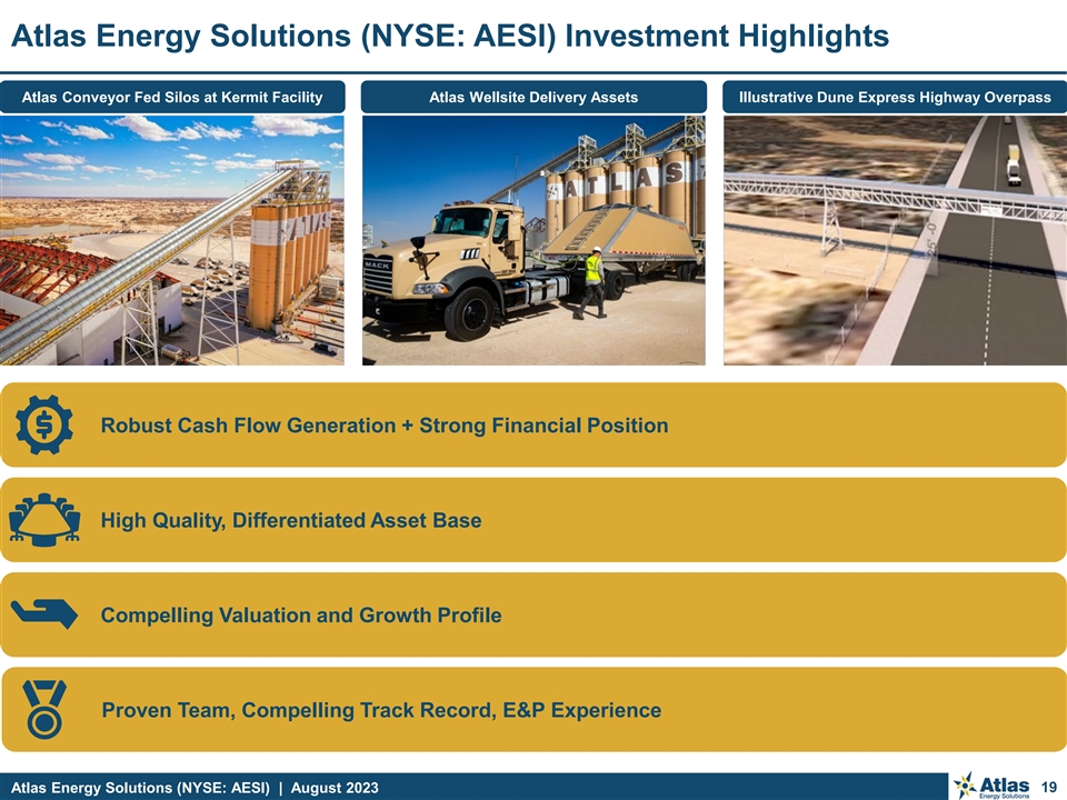 Management’s E&P Background and Track Record of Value Creation Disruptive Oil & Gas Ventures with Track Record of Success Management’s E&P Background Drives Customer Success What We Observed Through an E&P Operator’s Lens Pioneering Use of 3D Seismic, Disruption in Horizontal D&C Techniques within the Oil-Rich Bakken Shale The Permian is North America’s premier shale resource IPO in 1997 Proppant is mission-critical to efficient shale development Sold to Statoil in 2011 for $4.7 billion — Logistics challenges are a barrier to optimization The sector was primed for positive disruption due to inefficiencies: Drilling & Completion Innovations in Delaware Basin; Early Adopter of E-Frac & Proppant Loading >5,000 lbs per foot — Out-of-basin proppant not cost effective — Plants not designed for just-in-time demand model Sold to Diamondback Energy, Inc. in 2017 for $2.6 billion — Local roadways overwhelmed by robust activity levels Need for high-quality, reliable and efficient in-basin sand Technically Sophisticated Tier One Minerals Model Our Differentiated Approach to Transform the Market + SESP IPO in 2019 Focused on giant open dunes with unique geologic attributes Sitio Merger = $2.2 billion value to MNRL (1) — Plentiful water, quality product, high mining yields 145% total return from IPO to sale Plants designed with operator mindset; scaled for efficiency with Differentiated Permian Pure-Play Proppant Producer with multiple redundancies to minimize downtime Game Changing Logistics Platform Culture of technological innovation drives Atlas’s growth (2) Q2 2023 Adj. EBITDA of $92.8 million (2) Q2 2023 Adj. EBITDA Margin of 57.4% We have “walked the walk” on sustainability, putting shareholders (2) Q2 2023 Net Income of $71.2 million and corporate integrity first to drive Sustainable Environmental (2) Q2 2023 Net Income Margin of 44.0% and Social Progress (“SESP”) Note: Past performance by members of our management team, our directors or their respective affiliates may not be indicative of future performance. | Source: Bloomberg, public disclosures. | (1) Total return calculated as cumulative dividends plus stock price appreciation (IPO date through 28-Dec-2022, includes the reinvestment of dividends and is pro forma for Sitio merger). | (2) Non-GAAP financial measure. See Appendix for reconciliations of non-GAAP measures to the nearest GAAP measures. Atlas Energy Solutions (NYSE: AESI) | August 2023 18 Proven Team, Compelling Track Record, E&P Experience