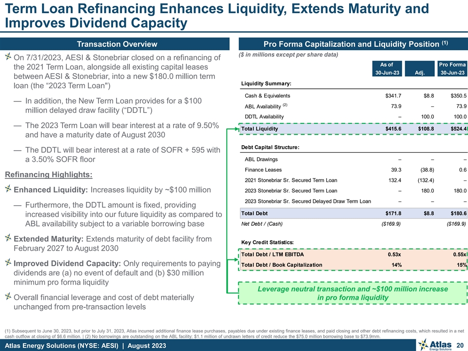 Term Loan Refinancing Enhances Liquidity, Extends Maturity and Improves Dividend Capacity (1) Transaction Overview Pro Forma Capitalization and Liquidity Position ($ in millions except per share data) On 7/31/2023, AESI & Stonebriar closed on a refinancing of As of Pro Forma the 2021 Term Loan, alongside all existing capital leases 30-Jun-23 Adj. 30-Jun-23 between AESI & Stonebriar, into a new $180.0 million term Liquidity Summary: loan (the “2023 Term Loan ) Cash & Equivalents $341.7 $8.8 $350.5 — In addition, the New Term Loan provides for a $100 (2) 73.9 – 73.9 ABL Availability million delayed draw facility (“DDTL”) DDTL Availability – 100.0 100.0 — The 2023 Term Loan will bear interest at a rate of 9.50% Total Liquidity $415.6 $108.8 $524.4 and have a maturity date of August 2030 Debt Capital Structure: — The DDTL will bear interest at a rate of SOFR + 595 with ABL Drawings – – – a 3.50% SOFR floor Finance Leases 39.3 (38.8) 0.6 Refinancing Highlights: 2021 Stonebriar Sr. Secured Term Loan 132.4 (132.4) – Enhanced Liquidity: Increases liquidity by ~$100 million 2023 Stonebriar Sr. Secured Term Loan – 180.0 180.0 2023 Stonebriar Sr. Secured Delayed Draw Term Loan – – – — Furthermore, the DDTL amount is fixed, providing Total Debt $171.8 $8.8 $180.6 increased visibility into our future liquidity as compared to Net Debt / (Cash) ($169.9) ($169.9) ABL availability subject to a variable borrowing base Extended Maturity: Extends maturity of debt facility from Key Credit Statistics: February 2027 to August 2030 Total Debt / LTM EBITDA 0.53x 0.55x Improved Dividend Capacity: Only requirements to paying Total Debt / Book Capitalization 14% 15% dividends are (a) no event of default and (b) $30 million minimum pro forma liquidity Leverage neutral transaction and ~$100 million increase Overall financial leverage and cost of debt materially in pro forma liquidity unchanged from pre-transaction levels (1) Subsequent to June 30, 2023, but prior to July 31, 2023, Atlas incurred additional finance lease purchases, payables due under existing finance leases, and paid closing and other debt refinancing costs, which resulted in a net cash outflow at closing of $6.6 million. | (2) No borrowings are outstanding on the ABL facility; $1.1 million of undrawn letters of credit reduce the $75.0 million borrowing base to $73.9mm. Atlas Energy Solutions (NYSE: AESI) | August 2023 20