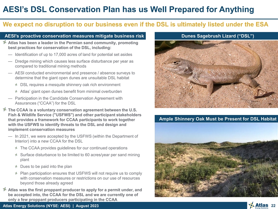 AESI’s DSL Conservation Plan has us Well Prepared for Anything We expect no disruption to our business even if the DSL is ultimately listed under the ESA AESI’s proactive conservation measures mitigate business risk Dunes Sagebrush Lizard (“DSL”) Atlas has been a leader in the Permian sand community, promoting best practices for conservation of the DSL, including: — Identification of up to 17,000 acres of land for potential set asides — Dredge mining which causes less surface disturbance per year as compared to traditional mining methods — AESI conducted environmental and presence / absence surveys to determine that the giant open dunes are unsuitable DSL habitat DSL requires a mesquite shinnery oak rich environment Atlas’ giant open dunes benefit from minimal overburden — Participation in the Candidate Conservation Agreement with Assurances (“CCAA”) for the DSL The CCAA is a voluntary conservation agreement between the U.S. Fish & Wildlife Service ( USFWS ) and other participant stakeholders Ample Shinnery Oak Must be Present for DSL Habitat that provides a framework for CCAA participants to work together with the USFWS to identify threats to the DSL and design and implement conservation measures — In 2021, we were accepted by the USFWS (within the Department of Interior) into a new CCAA for the DSL The CCAA provides guidelines for our continued operations Surface disturbance to be limited to 60 acres/year per sand mining plant Dues to be paid into the plan Plan participation ensures that USFWS will not require us to comply with conservation measures or restrictions on our use of resources beyond those already agreed Atlas was the first proppant producer to apply for a permit under, and be accepted into, the CCAA for the DSL and we are currently one of only a few proppant producers participating in the CCAA Atlas Energy Solutions (NYSE: AESI) | August 2023 22