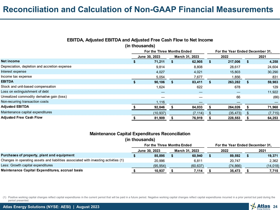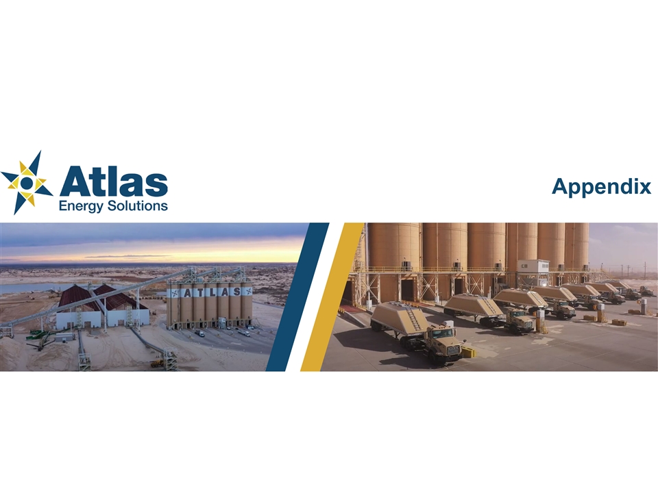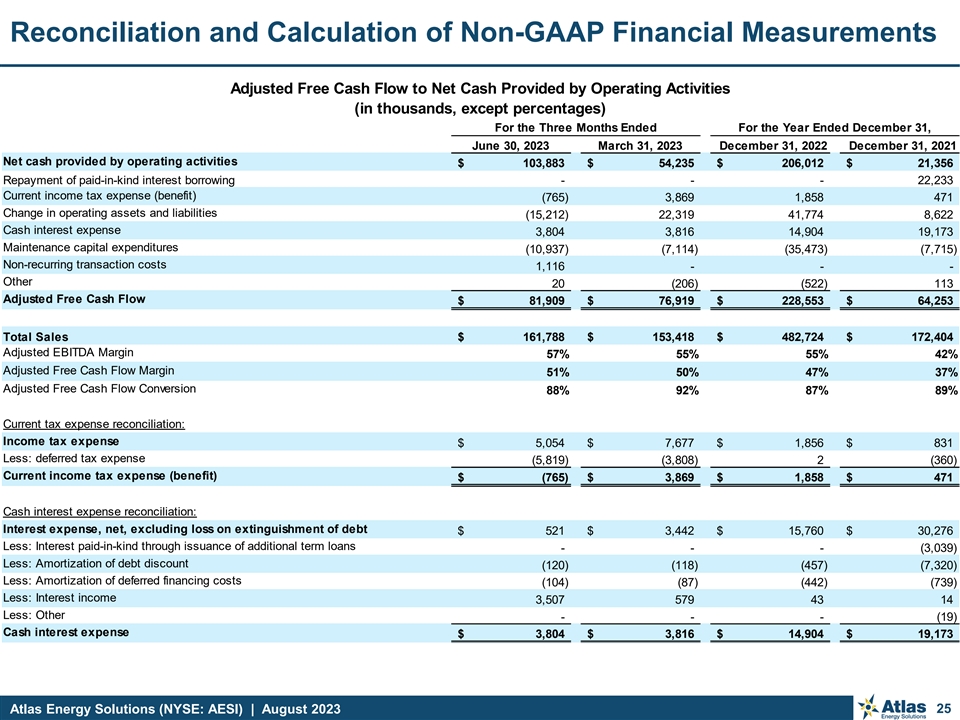 Reconciliation and Calculation of Non-GAAP Financial Measurements EBITDA, Adjusted EBITDA and Adjusted Free Cash Flow to Net Income (in thousands) For the Three Months Ended For the Year Ended December 31, June 30, 2023 March 31, 2023 2022 2021 Net income $ 71, 211 $ 62, 905 $ 217,006 $ 4,258 Depreciation, depletion and accretion expense 9,814 8,808 28,617 24,604 Interest expense 4,027 4,021 15,803 30,290 Income tax expense 5,054 7,677 1,856 831 EBITDA $ 90,106 $ 83, 411 $ 263,282 $ 59,983 Stock and unit-based compensation 1,624 622 678 129 Loss on extinguishment of debt — — — 11,922 Unrealized commodity derivative gain (loss) — — 66 ( 66) Non-recurring transaction costs 1,116 — — — Adjusted EBITDA $ 92, 846 $ 84, 033 $ 264,026 $ 71,968 Maintenance capital expenditures (10,937) (7,114) $ (35,473) $ (7,715) Adjusted Free Cash Flow $ 81, 909 $ 76, 919 $ 228,553 $ 64,253 Maintenance Capital Expenditures Reconciliation (in thousands) For the Three Months Ended For the Year Ended December 31, June 30, 2023 March 31, 2023 2022 2021 Purchases of property, plant and equipment $ 85, 895 $ 60,940 $ 89,592 $ 19,371 Changes in operating assets and liabilities associated with investing activities (1) 20,996 6,811 20,747 2,362 Less: Growth capital expenditures (95,954) (60,637) (74,866) (14,018) Maintenance Capital Expenditures, accrual basis $ 10, 937 $ 7,114 $ 35, 473 $ 7,715 (1) Positive working capital changes reflect capital expenditures in the current period that will be paid in a future period. Negative working capital changes reflect capital expenditures incurred in a prior period but paid during the period presented. Atlas Energy Solutions (NYSE: AESI) | August 2023 24