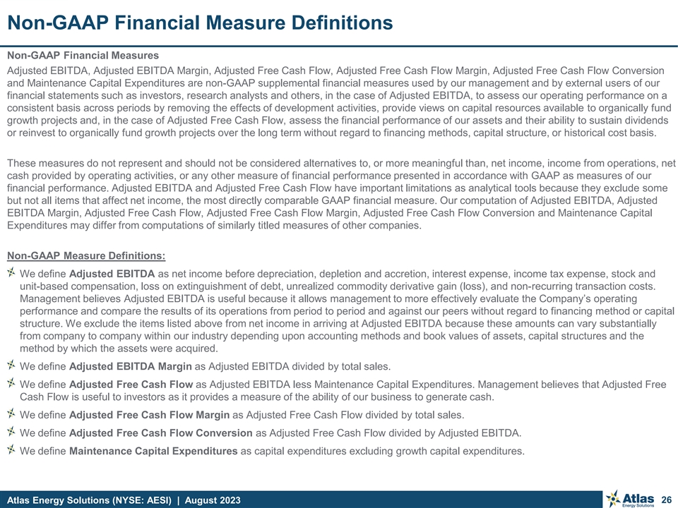 Reconciliation and Calculation of Non-GAAP Financial Measurements Adjusted Free Cash Flow to Net Cash Provided by Operating Activities (in thousands, except percentages) For the Three Months Ended For the Year Ended December 31, June 30, 2023 March 31, 2023 December 31, 2022 December 31, 2021 Net cash provided by operating activities $ 103,883 $ 54, 235 $ 206,012 $ 21, 356 Repayment of paid-in-kind interest borrowing - - - 22,233 Current income tax expense (benefit) (765) 3,869 1,858 471 Change in operating assets and liabilities (15,212) 22,319 41,774 8,622 Cash interest expense 3,804 3,816 14,904 19,173 Maintenance capital expenditures (10,937) (7,114) (35,473) (7,715) Non-recurring transaction costs 1,116 - - - Other 20 (206) (522) 113 Adjusted Free Cash Flow $ 81, 909 $ 76, 919 $ 228,553 $ 64, 253 Total Sales $ 161,788 $ 153,418 $ 482,724 $ 172,404 Adjusted EBITDA Margin 57% 55% 55% 42% Adjusted Free Cash Flow Margin 51% 50% 47% 37% Adjusted Free Cash Flow Conversion 88% 92% 87% 89% Current tax expense reconciliation: Income tax expense $ 5,054 $ 7,677 $ 1,856 $ 831 Less: deferred tax expense (5,819) (3,808) 2 (360) Current income tax expense (benefit) $ (765) $ 3,869 $ 1,858 $ 471 Cash interest expense reconciliation: Interest expense, net, excluding loss on extinguishment of debt $ 521 $ 3,442 $ 15, 760 $ 30, 276 Less: Interest paid-in-kind through issuance of additional term loans - - - (3,039) Less: Amortization of debt discount (120) (118) (457) (7,320) Less: Amortization of deferred financing costs (104) ( 87) (442) (739) Less: Interest income 3,507 579 43 14 Less: Other - - - ( 19) Cash interest expense $ 3,804 $ 3,816 $ 14, 904 $ 19, 173 Atlas Energy Solutions (NYSE: AESI) | August 2023 25
