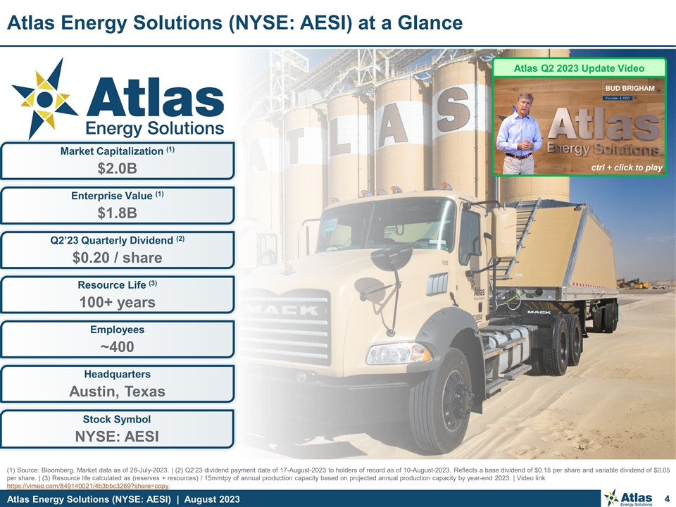 Important Disclosures Trademarks and Trade Names The Company owns or has rights to various trademarks, service marks and trade names that it uses in connection with the operation of its business. This presentation also contains trademarks, service marks and trade names of third parties, which are the property of their respective owners. The use or display of third parties’ trademarks, service marks, trade names or products in this presentation is not intended to, and does not imply, a relationship with the Company, or an endorsement or sponsorship by or of the Company. Solely for convenience, the trademarks, service marks and trade names referred to in this presentation may appear without the ®, TM or SM symbols, but such references are not intended to indicate, in any way, that the Company will not assert, to the fullest extent under applicable law, its rights or the right of the applicable licensor to these trademarks, service marks and trade names. Industry and Market Data This presentation has been prepared by the Company and includes market data and certain other statistical information from third-party sources, including independent industry publications, government publications, and other published independent sources. Although we believe these third-party sources are reliable as of their respective dates, we have not independently verified the accuracy or completeness of this information. Some data is also based on our good faith estimates, which are derived from our review of internal sources as well as the third-party sources described above. The industry in which we operate is subject to a high degree of uncertainty and risk due to a variety of factors. These and other factors could cause results to differ materially from those expressed in these third-party publications. Additionally, descriptions herein of market conditions and opportunities are presented for informational purposes only; there can be no assurance that such conditions will actually occur. Please also see “Forward-Looking Statements” disclaimer above. No Offer or Solicitation This communication relates to the Up-C Simplification between the Company and New Atlas. This communication is for informational purposes only and does not constitute an offer to sell or the solicitation of an offer to buy any securities or a solicitation of any vote or approval, in any jurisdiction, pursuant to the Up-C Simplification or otherwise, nor shall there be any sale, issuance, exchange or transfer of the securities referred to in this document in any jurisdiction in contravention of applicable law. No offer of securities shall be made except by means of a prospectus meeting the requirements of Section 10 of the Securities Act. Important Additional Information In connection with the Up-C Simplification, New Atlas will file with the SEC a registration statement on Form S-4, which will include an information statement of the Company and a prospectus of New Atlas. The Company and New Atlas may also file other documents with the SEC regarding the Up-C Simplification. After the registration statement has been declared effective by the SEC, a definitive information statement/prospectus will be mailed to the shareholders of the Company. This document is not a substitute for the registration statement and information statement/prospectus that will be filed with the SEC or any other documents that the Company or New Atlas may file with the SEC or send to shareholders of the Company in connection with the Up-C Simplification. INVESTORS AND SHAREHOLDERS OF THE COMPANY ARE URGED TO READ THE REGISTRATION STATEMENT AND INFORMATION STATEMENT/PROSPECTUS WHEN IT BECOMES AVAILABLE AND ALL OTHER RELEVANT DOCUMENTS THAT ARE FILED OR WILL BE FILED WITH THE SEC, AS WELL AS ANY AMENDMENTS OR SUPPLEMENTS TO THESE DOCUMENTS, CAREFULLY AND IN THEIR ENTIRETY BECAUSE THEY WILL CONTAIN IMPORTANT INFORMATION ABOUT THE UP-C SIMPLIFICATION AND RELATED MATTERS. Investors and shareholders will be able to obtain free copies of the registration statement and the information statement/prospectus (when available) and all other documents filed or that will be filed with the SEC by the Company or New Atlas, through the website maintained by the SEC at www.sec.gov. These documents (when they are available) can also be obtained free of charge from the Company or New Atlas by directing a written request to Atlas Energy Solutions Inc., 5918 W. Courtyard Drive, Suite 500, Austin, Texas 78730, Attention: Investor Relations, Telephone: 512-220-1200. Atlas Energy Solutions (NYSE: AESI) | August 2023 3
