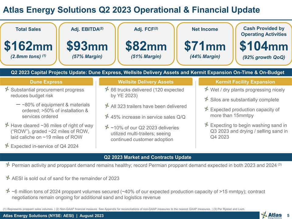 Atlas Energy Solutions (NYSE: AESI) at a Glance Atlas Q2 2023 Update Video (1) Market Capitalization ctrl + click to play $2.0B (1) Enterprise Value $1.8B (2) Q2’23 Quarterly Dividend $0.20 / share (3) Resource Life 100+ years Employees ~400 Headquarters Austin, Texas Stock Symbol NYSE: AESI (1) Source: Bloomberg. Market data as of 28-July-2023. | (2) Q2’23 dividend payment date of 17-August-2023 to holders of record as of 10-August-2023. Reflects a base dividend of $0.15 per share and variable dividend of $0.05 per share. | (3) Resource life calculated as (reserves + resources) / 15mmtpy of annual production capacity based on projected annual production capacity by year-end 2023. | Video link https://vimeo.com/849140021/4b3bbc3269?share=copy. Atlas Energy Solutions (NYSE: AESI) | August 2023 4