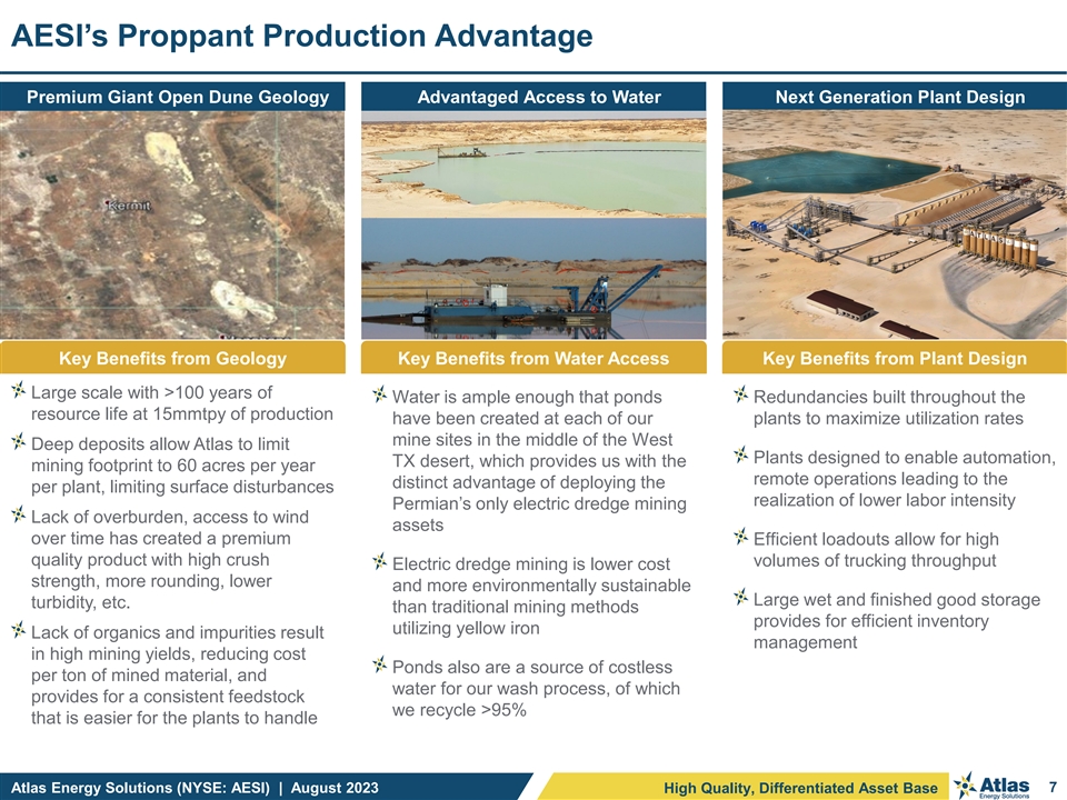 Atlas is a Leading Pure-Play Permian Proppant and Logistics Provider (2) Key Investment Highlights Pure Play Permian Asset Base Compelling Valuation and Growth Profile (1) Trading at a discount to peers High growth potential from ongoing capital projects Robust Cash Flow Generation + Strong Financial Position Strong and resilient margins Strong balance sheet with low financial leverage Low capital intensity required to maintain core business High Quality, Differentiated Asset Base Giant open dunes are best-in-class resource Plants with automation + redundancy maximize efficiency Water access enables low-cost electric dredge mining Atlas & Sustainable Environmental and Social Progress Dune express is a step-change in sand logistics A long-term focus on shareholders and profits also Fit-for-purpose trucking assets with expanded payloads produces favorable environmental and social outcomes: Proven Team, Compelling Track Record, E&P Experience Dune Express: 42-mile conveyor to transport sand into core Permian acreage will make roads safer, reduce emissions Bud Brigham led team with a track record of performance Fit-for-purpose wellsite delivery assets with significantly Long-time E&P operators now optimizing sand solutions expanded payloads and the potential for automation further Innovators applying proven technology in novel ways aims to enhance safety and emissions improvements Proven ability to return capital to shareholders Electric dredge mining = lower cost, lower emissions Source: Enverus, Baker Hughes, Public Filings, Bloomberg Consensus data. | (1) As of 28-July-2023. Peer group includes: SLB, BHI, HAL, NOV, FTI, WHD, OII, CHX, SES, SOI, ARIS, SLCA, USAC, AROC, XPRO, HLX. | (2) Represents planned Dune Express route based on secured rights-of-way and federal permits. Atlas Energy Solutions (NYSE: AESI) | August 2023 6