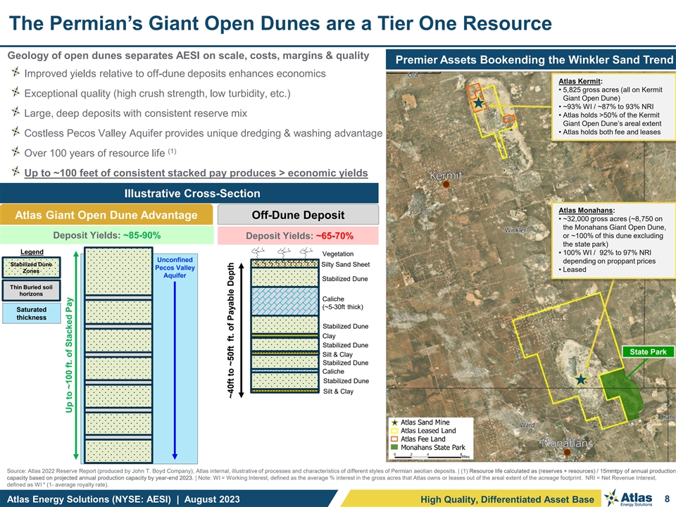 AESI’s Proppant Production Advantage Premium Giant Open Dune Geology Advantaged Access to Water Next Generation Plant Design Key Benefits from Geology: Key Benefits from Geology Key Benefits from Water Access: Key Benefits from Water Access Key Benefits from Plant Design: Key Benefits from Plant Design Large scale with >100 years of Water is ample enough that ponds Redundancies built throughout the resource life at 15mmtpy of production have been created at each of our plants to maximize utilization rates mine sites in the middle of the West Deep deposits allow Atlas to limit Plants designed to enable automation, TX desert, which provides us with the mining footprint to 60 acres per year remote operations leading to the distinct advantage of deploying the per plant, limiting surface disturbances realization of lower labor intensity Permian’s only electric dredge mining Lack of overburden, access to wind assets over time has created a premium Efficient loadouts allow for high quality product with high crush volumes of trucking throughput Electric dredge mining is lower cost strength, more rounding, lower and more environmentally sustainable Large wet and finished good storage turbidity, etc. than traditional mining methods provides for efficient inventory utilizing yellow iron Lack of organics and impurities result management in high mining yields, reducing cost Ponds also are a source of costless per ton of mined material, and water for our wash process, of which provides for a consistent feedstock we recycle >95% that is easier for the plants to handle Atlas Energy Solutions (NYSE: AESI) | August 2023 7 High Quality, Differentiated Asset Base