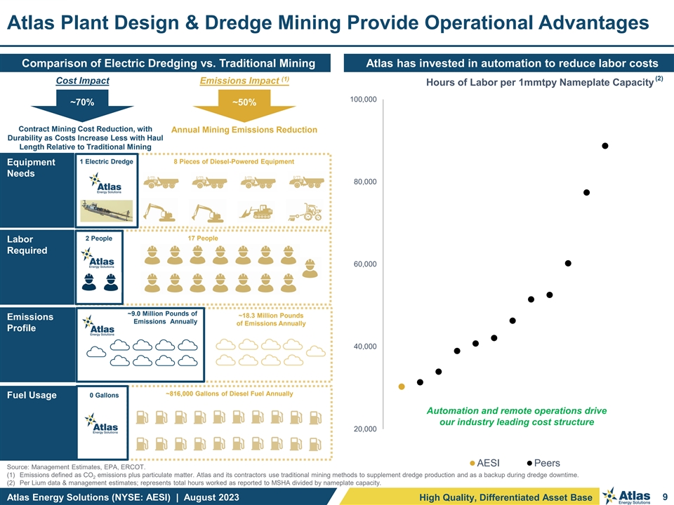 The Permian’s Giant Open Dunes are a Tier One Resource Geology of open dunes separates AESI on scale, costs, margins & quality Premier Assets Bookending the Winkler Sand Trend Improved yields relative to off-dune deposits enhances economics Atlas Kermit: • 5,825 gross acres (all on Kermit Exceptional quality (high crush strength, low turbidity, etc.) Giant Open Dune) • ~93% WI / ~87% to 93% NRI Large, deep deposits with consistent reserve mix • Atlas holds >50% of the Kermit Giant Open Dune’s areal extent • Atlas holds both fee and leases Costless Pecos Valley Aquifer provides unique dredging & washing advantage (1) Over 100 years of resource life Up to ~100 feet of consistent stacked pay produces > economic yields Illustrative Cross-Section Atlas Monahans: Atlas Giant Open Dune Advantage Off-Dune Deposit • ~32,000 gross acres (~8,750 on the Monahans Giant Open Dune, Deposit Yields: ~85-90% or ~100% of this dune excluding Deposit Yields: ~65-70% the state park) Legend • 100% WI / 92% to 97% NRI Vegetation Unconfined depending on proppant prices Stabilized Dune Silty Sand Sheet Pecos Valley • Leased Zones Aquifer Stabilized Dune Thin Buried soil horizons Caliche (~5-30ft thick) Saturated thickness Stabilized Dune Clay Stabilized Dune State Park Silt & Clay Stabilized Dune Caliche Stabilized Dune Silt & Clay Source: Atlas 2022 Reserve Report (produced by John T. Boyd Company), Atlas internal, illustrative of processes and characteristics of different styles of Permian aeolian deposits. | (1) Resource life calculated as (reserves + resources) / 15mmtpy of annual production capacity based on projected annual production capacity by year-end 2023. | Note: WI = Working Interest, defined as the average % interest in the gross acres that Atlas owns or leases out of the areal extent of the acreage footprint. NRI = Net Revenue Interest, defined as WI * (1- average royalty rate). Atlas Energy Solutions (NYSE: AESI) | August 2023 8 High Quality, Differentiated Asset Base Up to ~100 ft. of Stacked Pay ~40ft to ~50ft ft. of Payable Depth